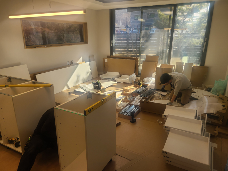 실제로 주방 공간은 그리 크지 않은데 배송 온 자재들의 부피가 워낙 커서 거실등의 공간이 충분치 않다면 미리 공간을 확보해 놓아야 한다. 우리는 이사전에 빈집 상태에서 작업하게 되어 큰 문제없이 진행되었다.